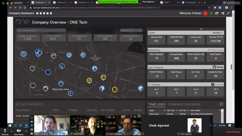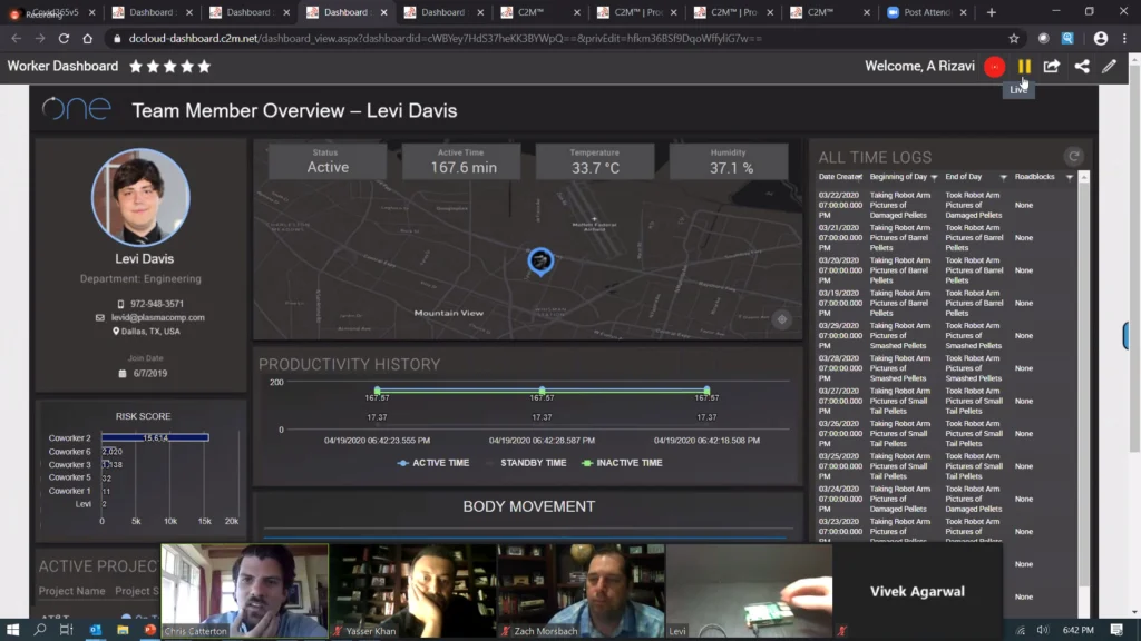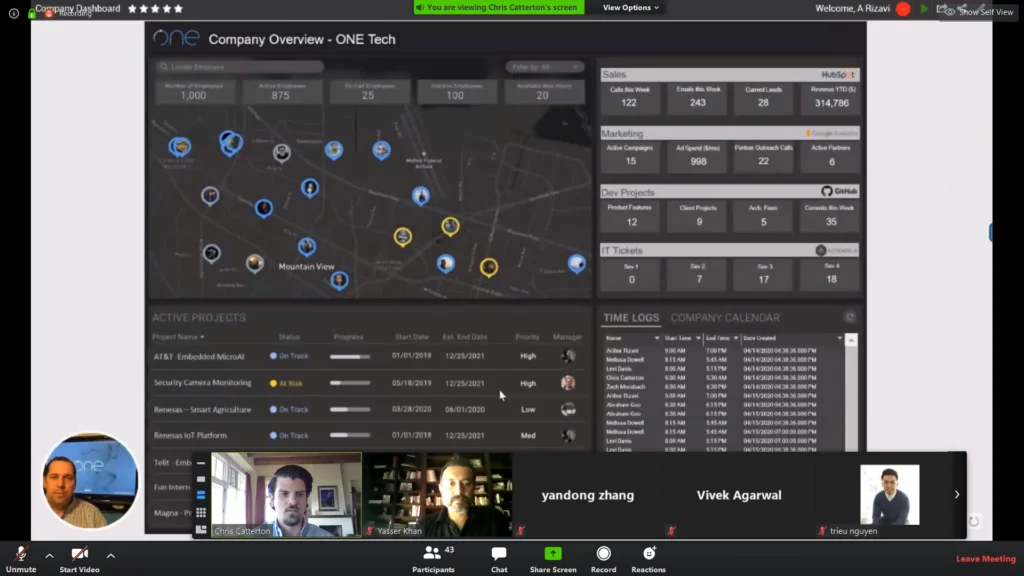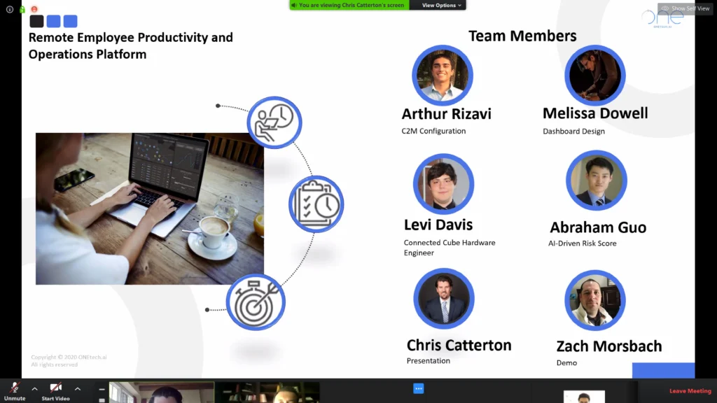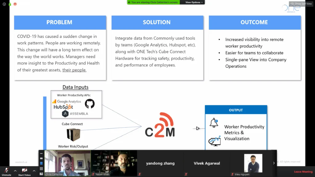 COVID-19 has caused a sudden change in work patterns. People are working remotely. This change will have a long term effect on the way the world works. Managers need more insight to the Productivity and Health of their greatest assets, their people. Our team created a product that integrates data from commonly used tools by teams (Google Analytics, Hubspot, etc), along with ONE Tech’s Cube Connect Hardware (Beta) for tracking safety, productivity, and performance of employees.