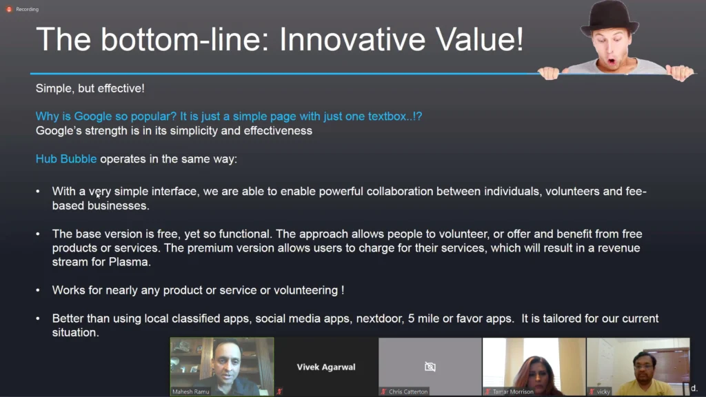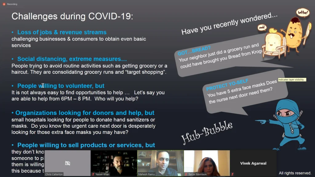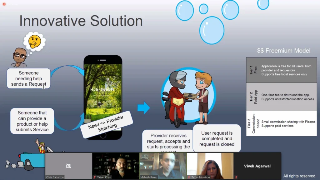 During COVID-19, we have seen so many challenges facing individuals and businesses and we wanted to create an application that allowed collaboration to support the community. The Hub-Bubble concept was developed from the idea of connecting (as a hub) different people who are quarantined (in their individual bubbles) so they could collaborate to provide free or for-a-fee goods, services and information. We also created a freemium tiered model so users could charge for their services to generate some additional income. The simple UX design built on the C2M© engine makes this application a formidable competitor against what is currently available on the market. It is unique in it’s simplicity. It was our goal to make this application for any user at any level of technological experience on any device.