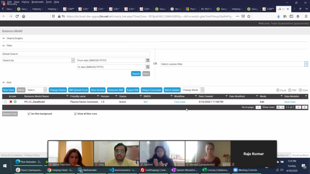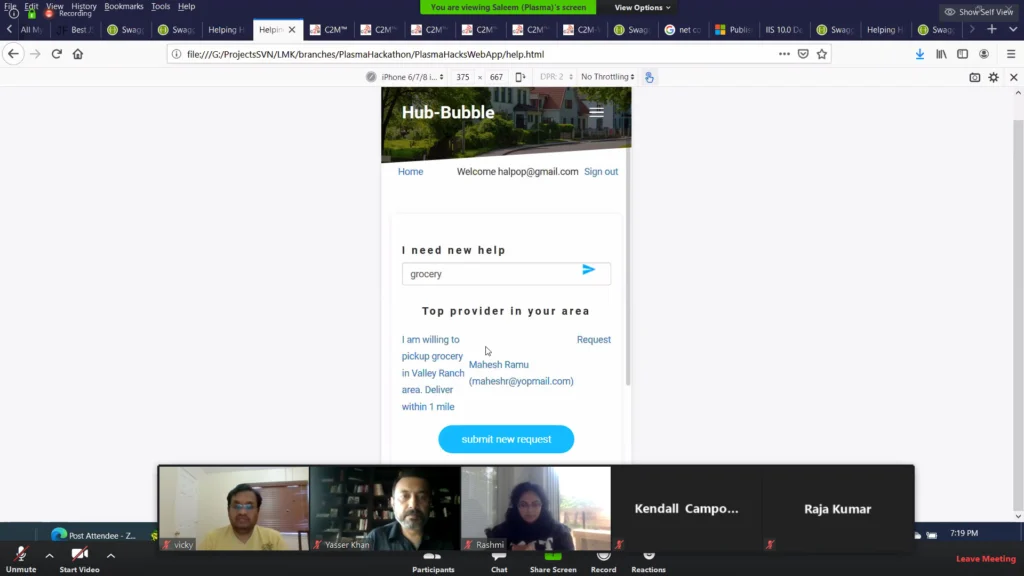The Quarantinis included a group of individuals with combined skills in Project Management, Business Analysis, UX/UI Design, and Development. Our team included; Mahesh Ramu who developed the concept and coordinated the overall project and provided supporting activities; Vicky Garg and Saleem Khan who were instrumental in the application development for the front-end and back-end; Kendall Campodonico who provided support in UX Design and graphics; and Tamar Morrison who provided business analysis and finalized the slide deck